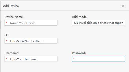 Enter a device name, device serial number, username, and password
